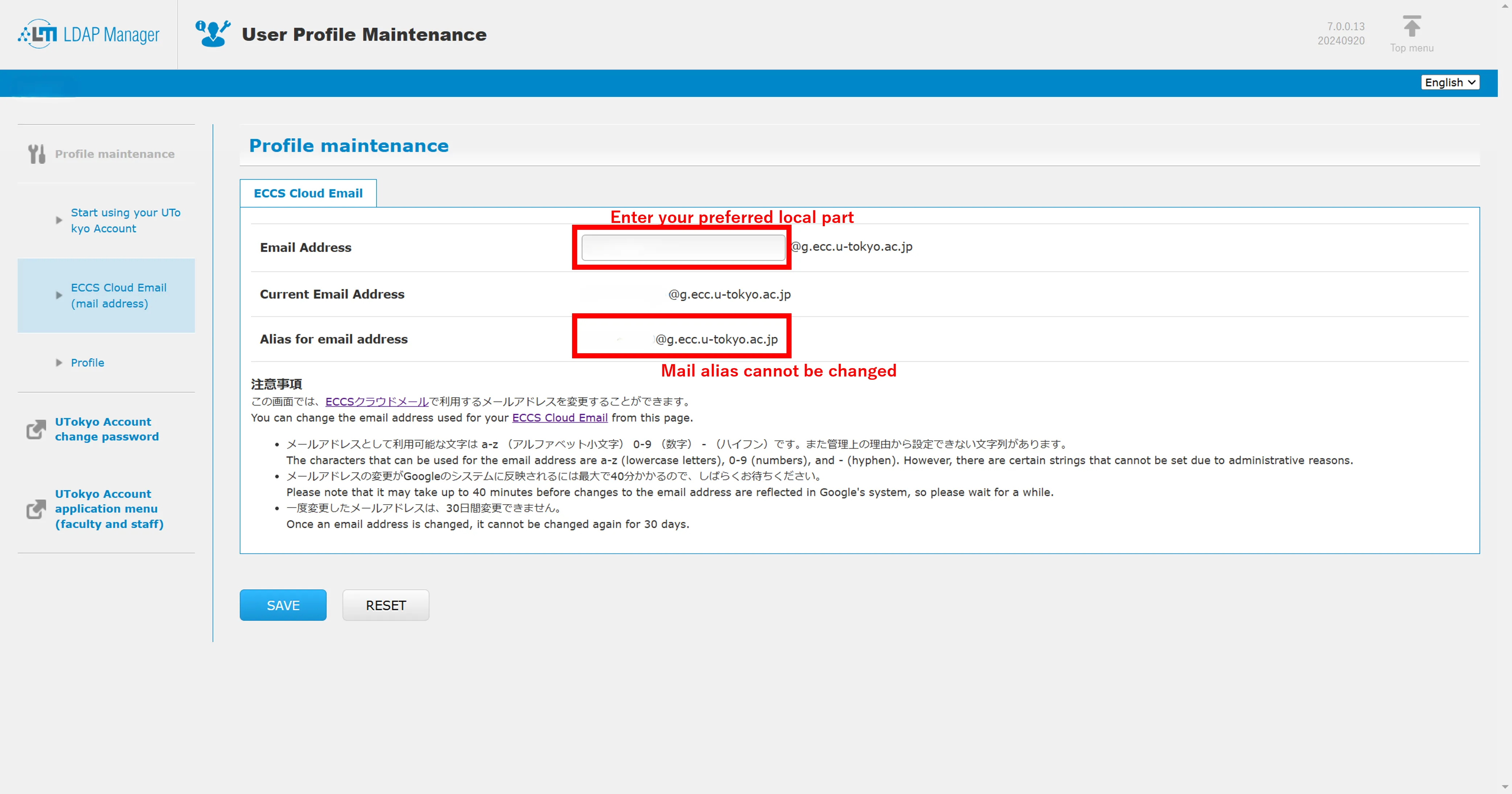 2. Click “ECCS Cloud Email (mail address)” on the left to open the email address setting page. Enter your preferred username in the “Email Address” field and click “SAVE”.