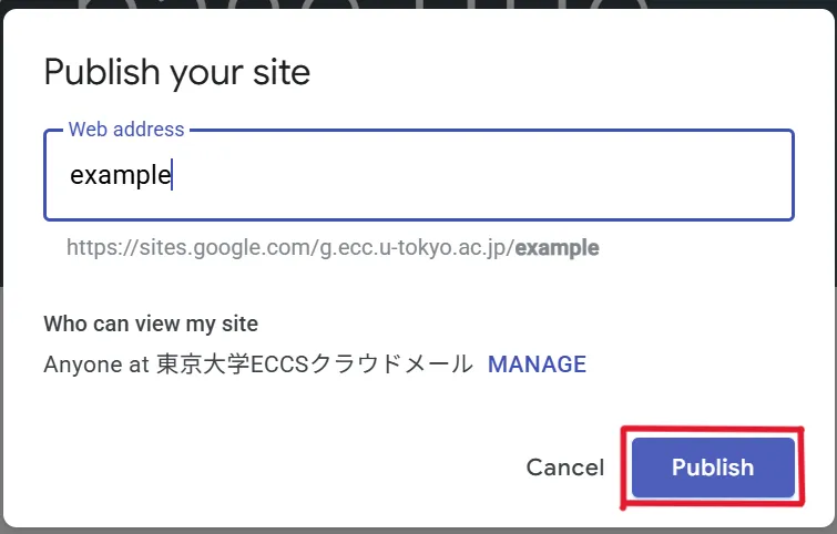 - If you select “The University of Tokyo ECCS Cloud Email”, only ECCS Cloud Email users will be able to view the site. Select this option if you want to limit the publication range to university members.