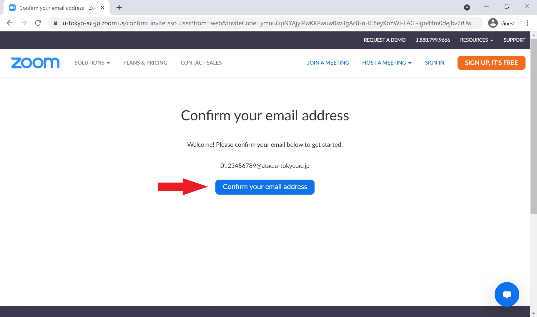 If you see the message "The email address "1234567890@utac.u-tokyo.ac.jp" is already in use" An account using 1234567890@utac.u-tokyo.ac.jp already exists. This account needs to be deleted. Please fill out and submit the Zoom Account Delete Request Form. After you receive an email confirming that deletion is completed, restart from step 1 to change your sign-in email address.