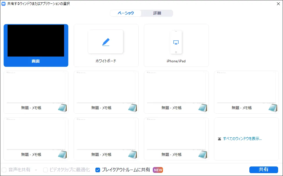 この機能を利用するには,画面共有を行う際のダイアログで,下部にある「ブレイクアウトルームに共有」のチェックボックスをオンにしてから「共有」ボタンを押してください.