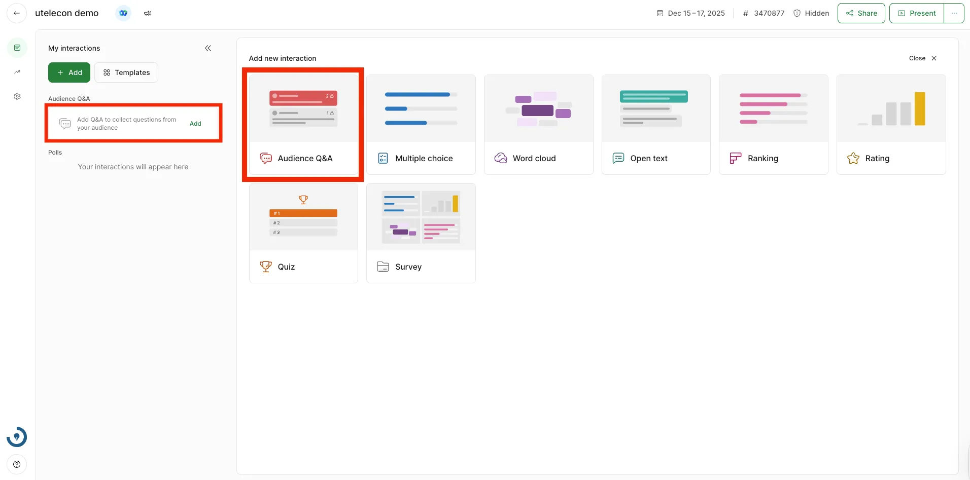 Q&Aを作成するには,画面左上または「Add new interaction」内の「Audience Q&A」を選択してください.