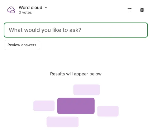 - Word cloudー参加者の回答が「cloud」として可視化される質問を設定する(参加者はOpen textと同様に短文形式で答える)