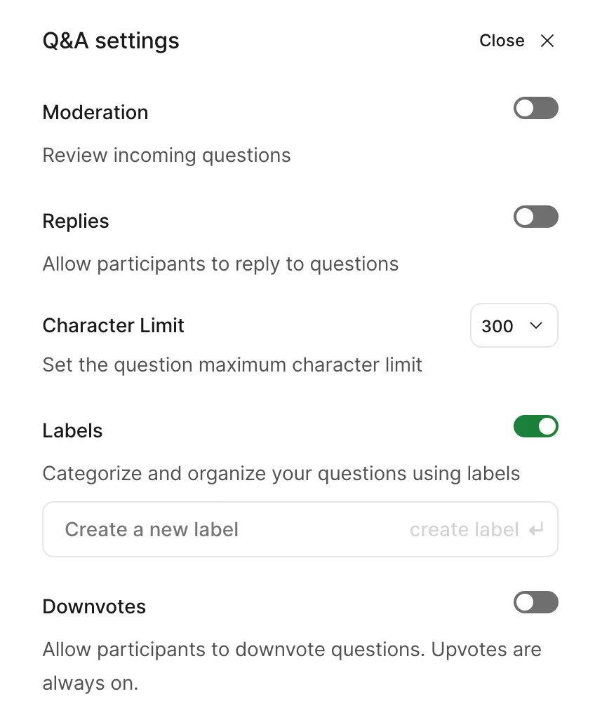 - Labels:この設定をオンにすると,質問を分類・管理するためのタグ(ラベル)機能を使用できます.また,「Create a new Label」欄から,新しいラベルを作成することができます.