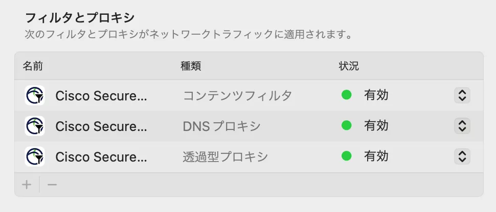 macOS 11 Big Sur以降のmacOSにCisco Secure Clientをインストールすると,「システム環境設定」→「ネットワーク」に以下のような Cisco Secure Client - Socket Filter という3つの拡張機能が追加されます.これらの拡張機能はUTokyo VPN接続時に通信を振り分けるために必要な機能として常駐しており,通信内容の記録やホスト外への情報送付も行いません.またこれらはUTokyo VPNに接続しているか否かに関わらず常時接続状態になります.