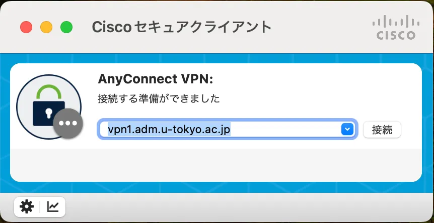 手順H: 再度Cisco Secure Clientをクリックし,現在の状態を確認します.表示された画面で,以下のように「vpn1.adm.u-tokyo.ac.jpに接続されています。」と表示されていれば,お使いの機器はUTokyo VPNに接続している状態です.