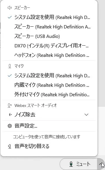 「ミュート」「カメラ」ボタンの右にある矢印をクリックすると,Webexで利用するスピーカー・マイク・カメラを選択することができます.
