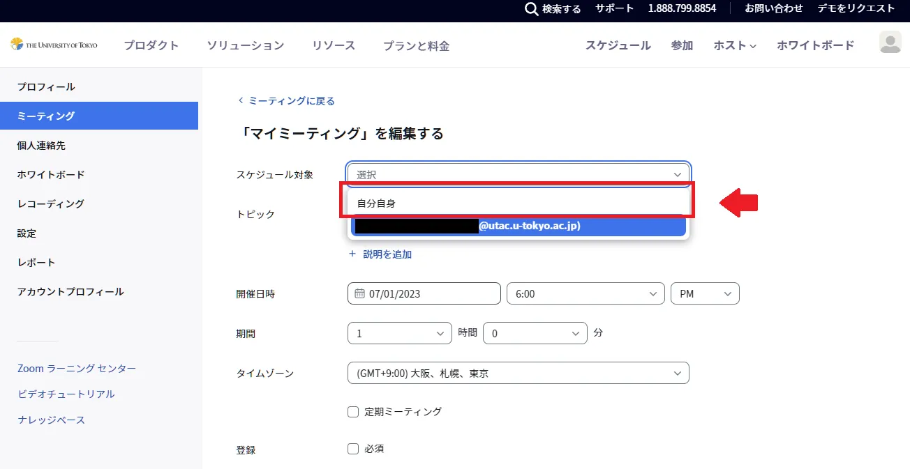 - その後は通常通りにミーティングを編集してください.なお,この編集画面で「スケジュール対象」を「自分自身」に変更をすると,当該ミーティングを親ユーザーのものから子ユーザーのものにすることが可能です.