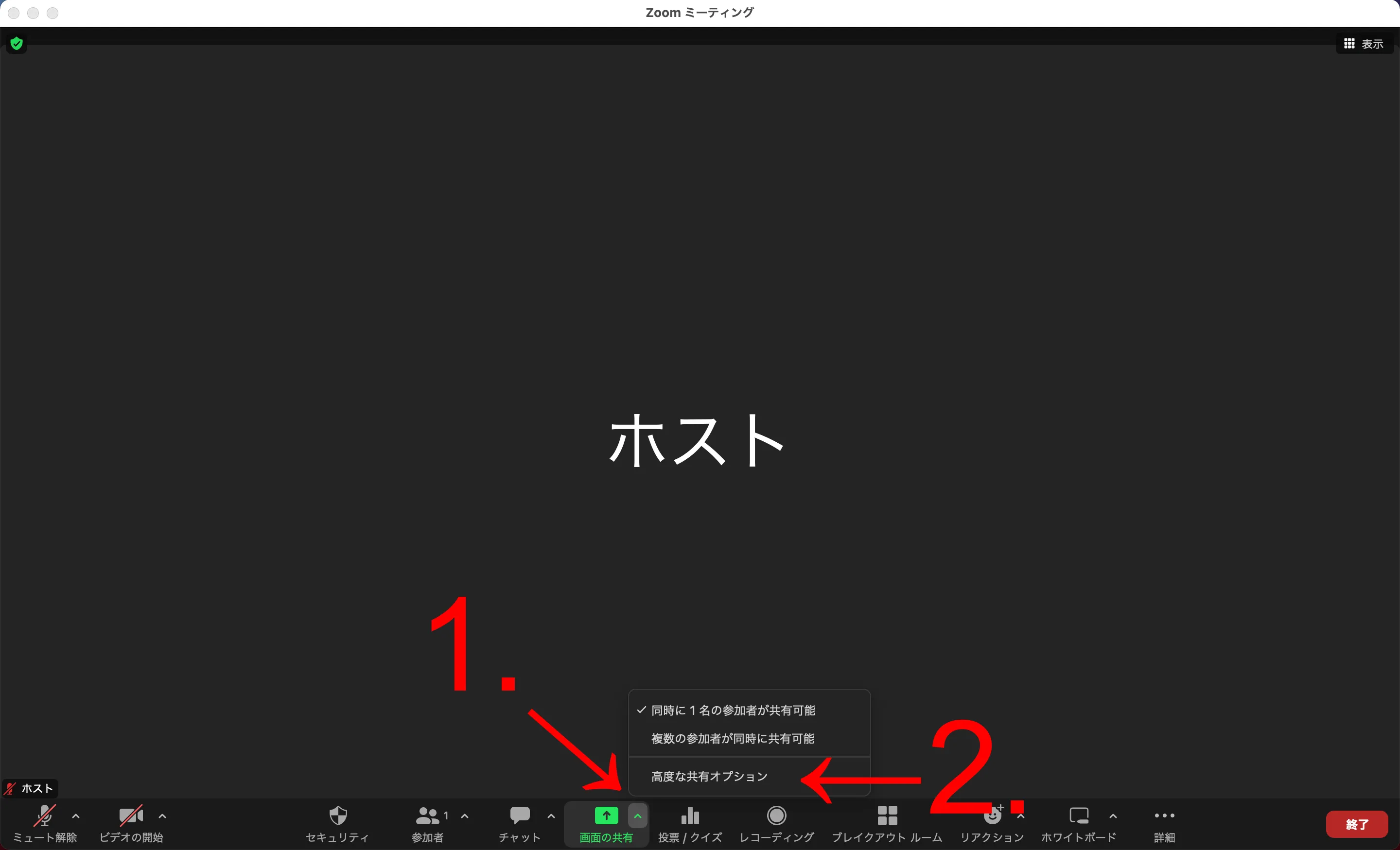 画面下部のコントロールツールバーにある「画面共有」の右の「^」マークを押してください.